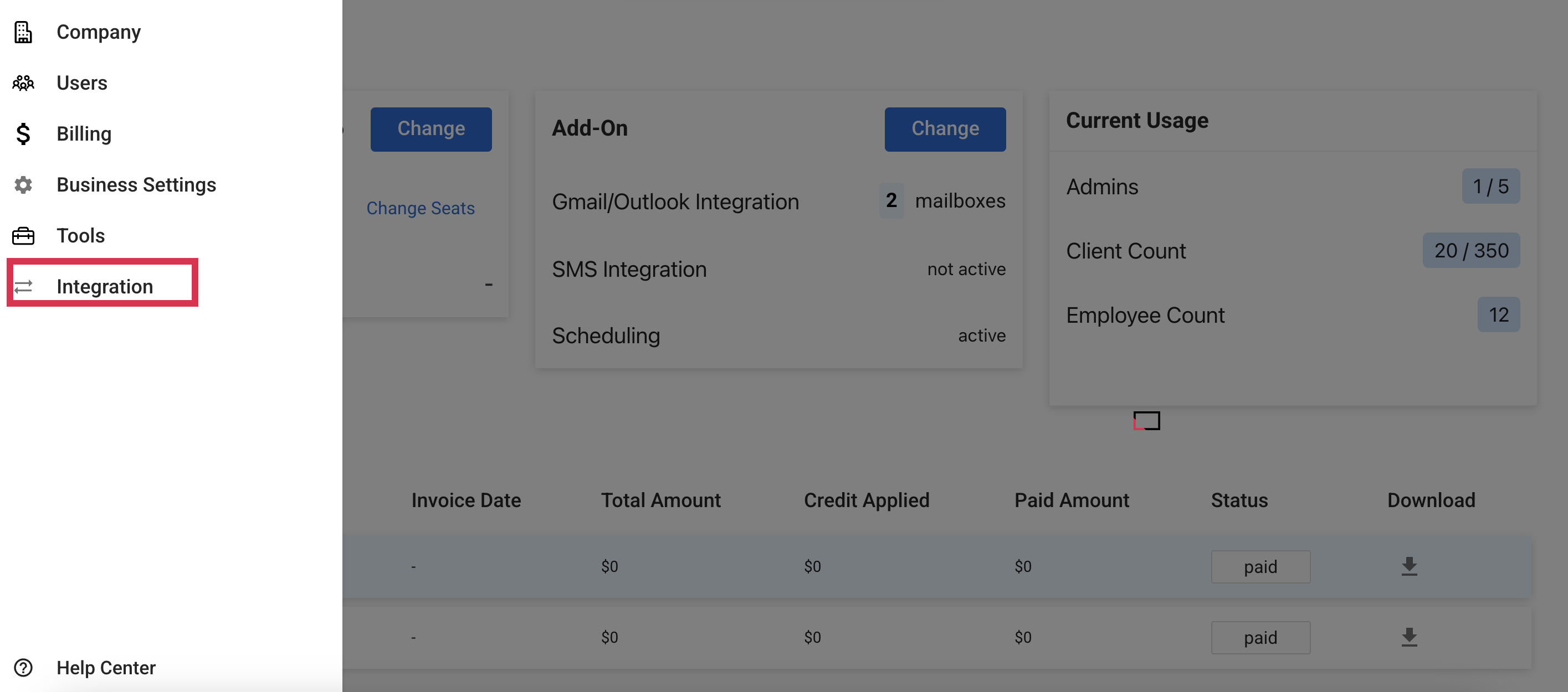 Step 1: Ensure your email integration is added by viewing the "Billing Section" under "Add-On"