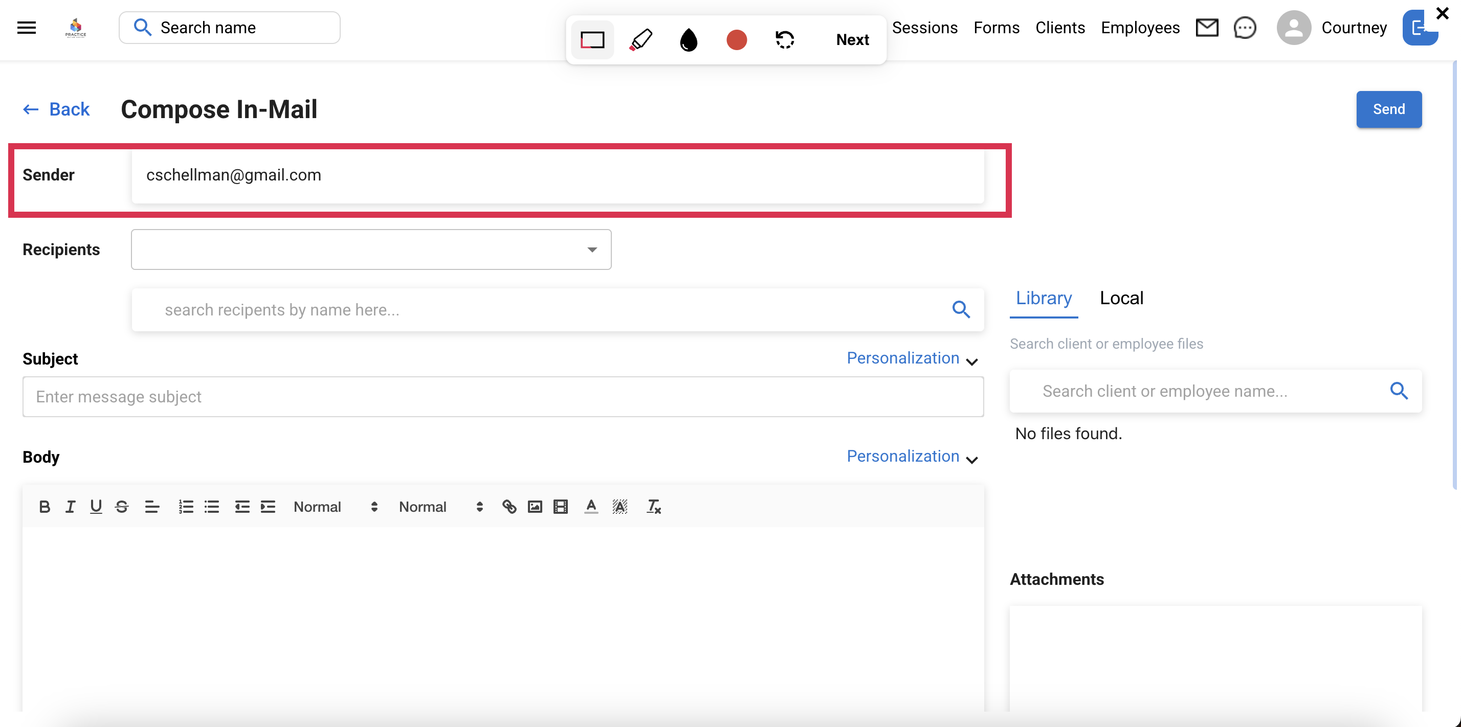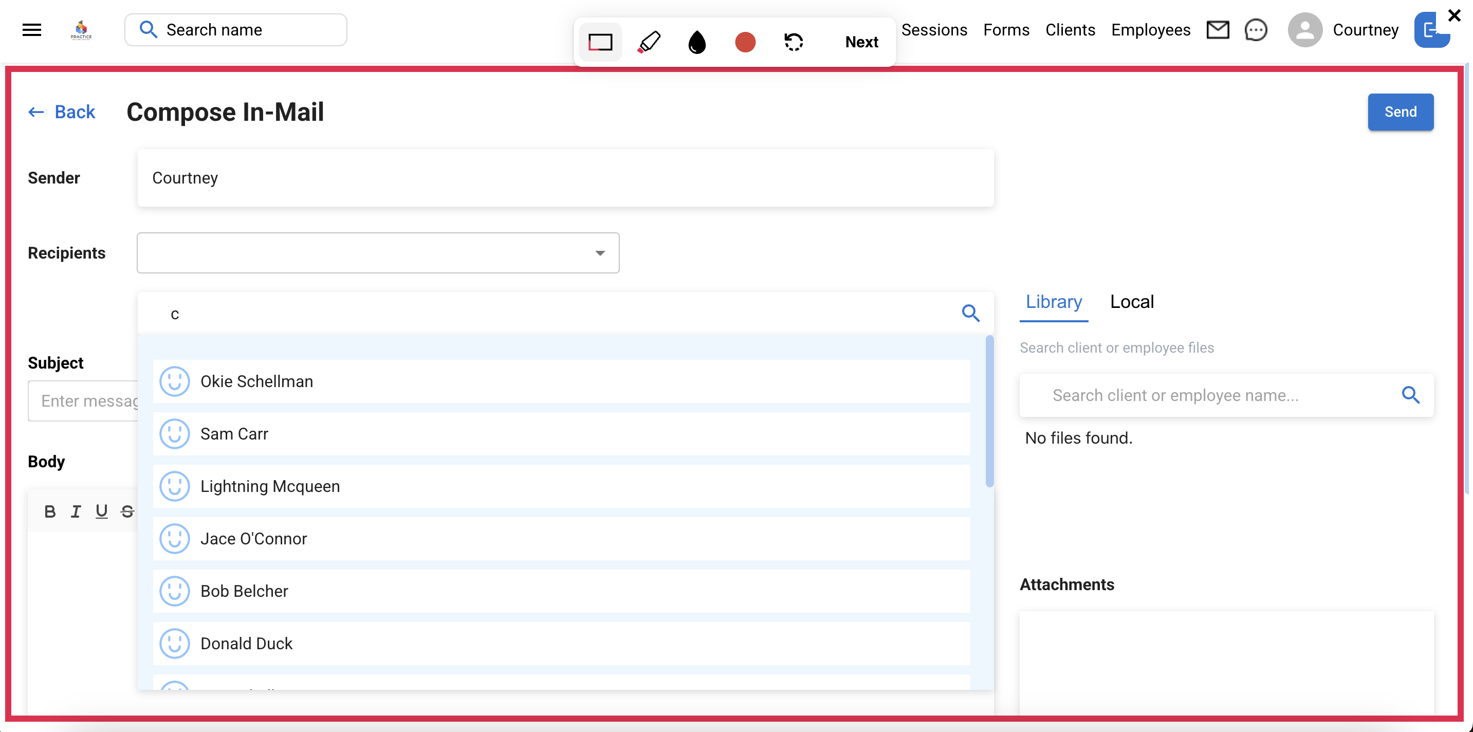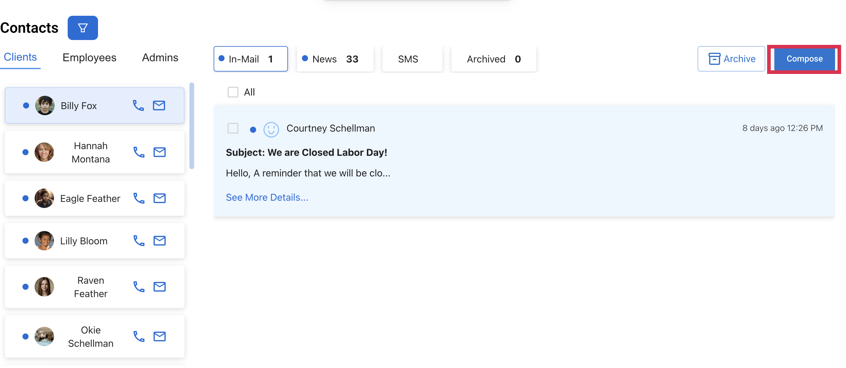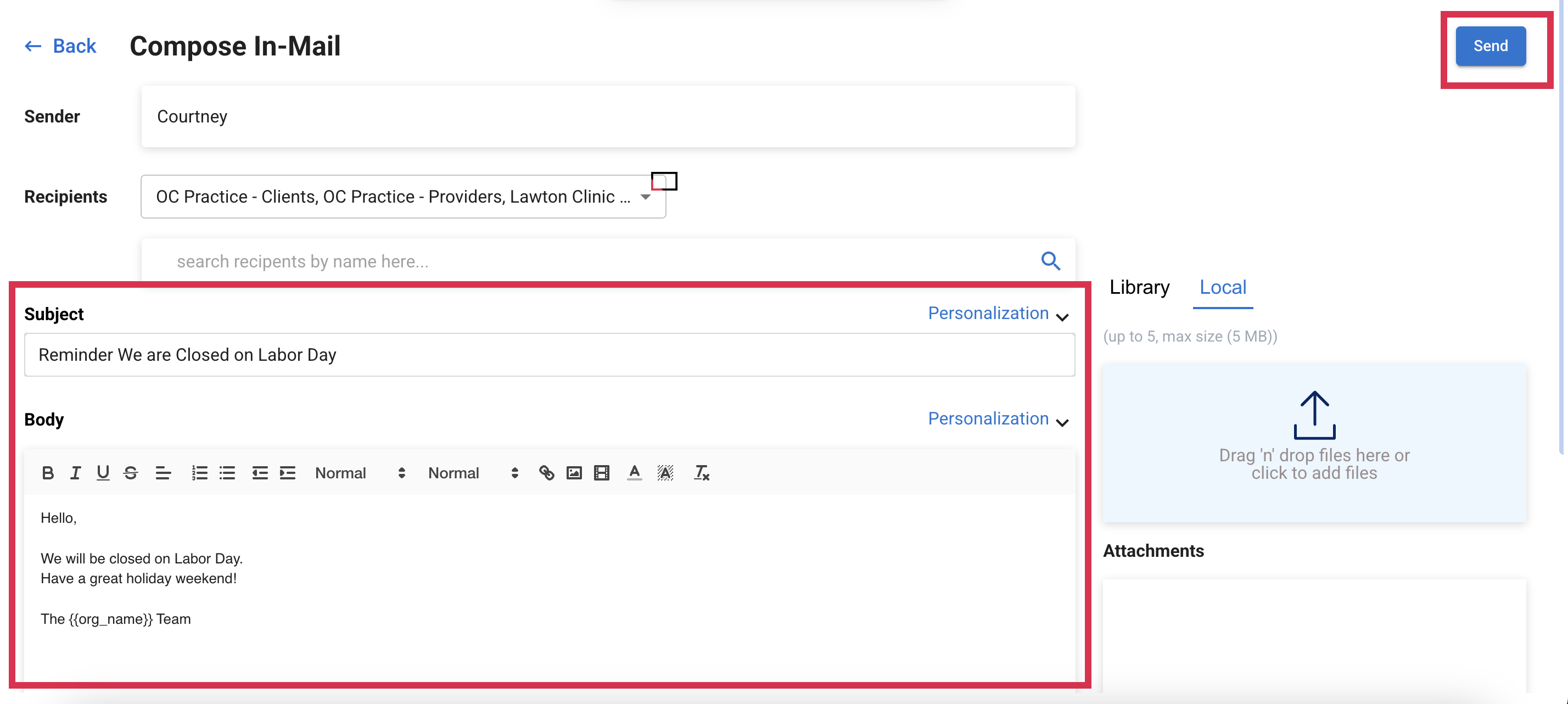 - You can upload documents and send them directly through the In-Mail system. This is great for sending company newsletters