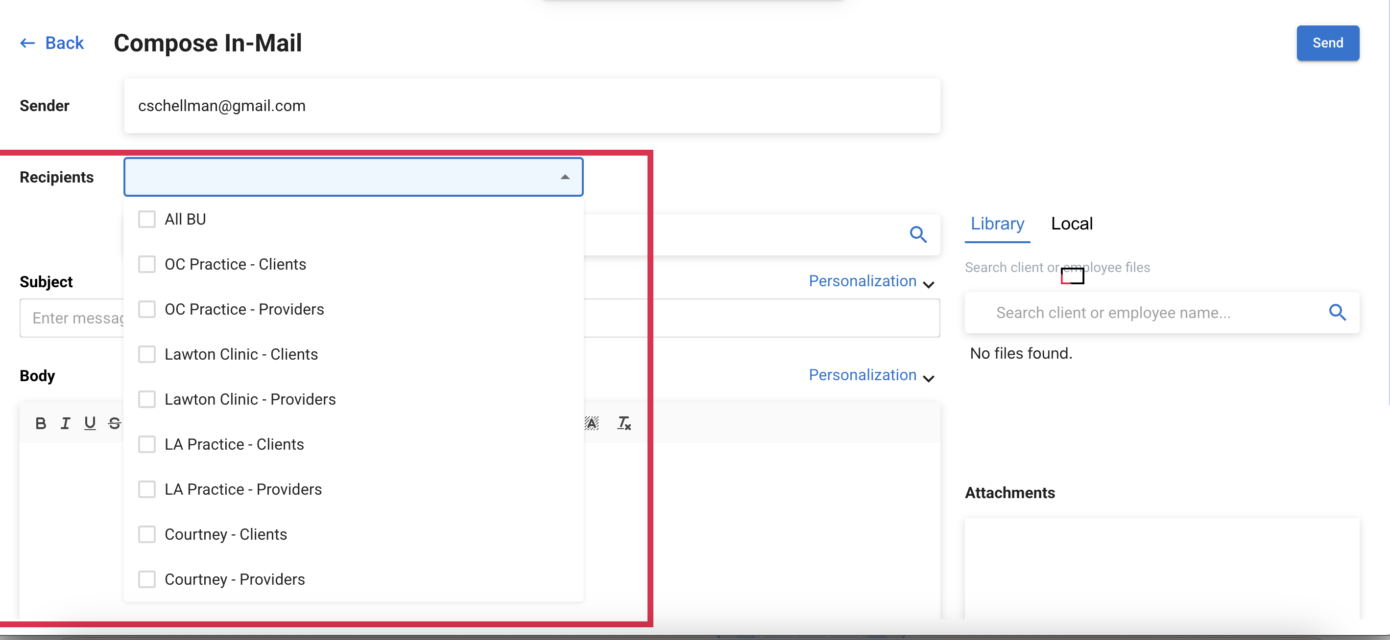 You can select individual recipients by typing a name, selecting all BU, selecting specific Business Units providers and/or clients, or by selecting multiple recipients.